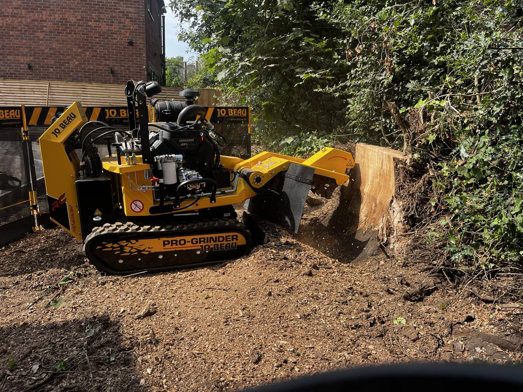 Manufactured in Belgium, the Jobeau stump grinder (B37-110 RC) redefines quality and functionality in the small stump grinder industry. Now available in the United States, the Jobeau B37 offers unmatched functionality. Full remote control with auto sweep function, the stump grinder can automatically lower the grinding wheel an inch on every sweep. Other features include: